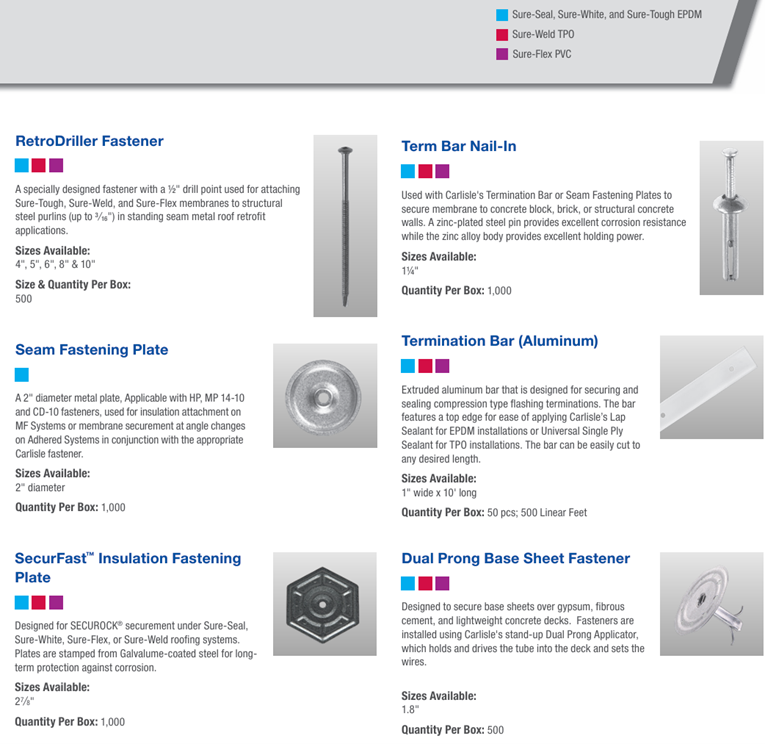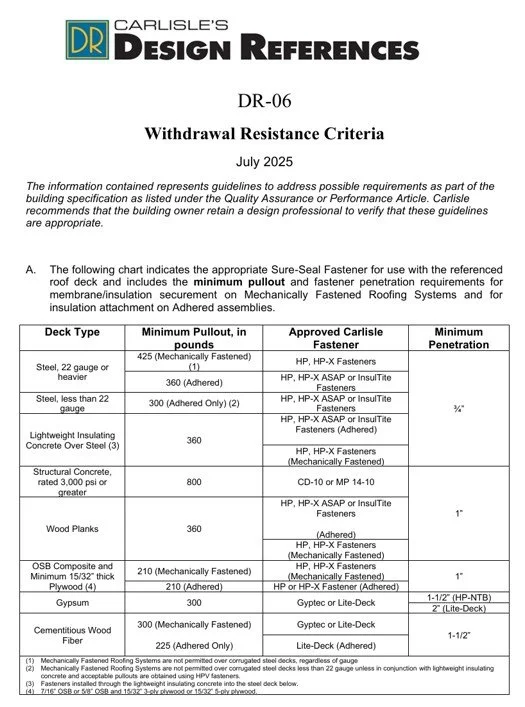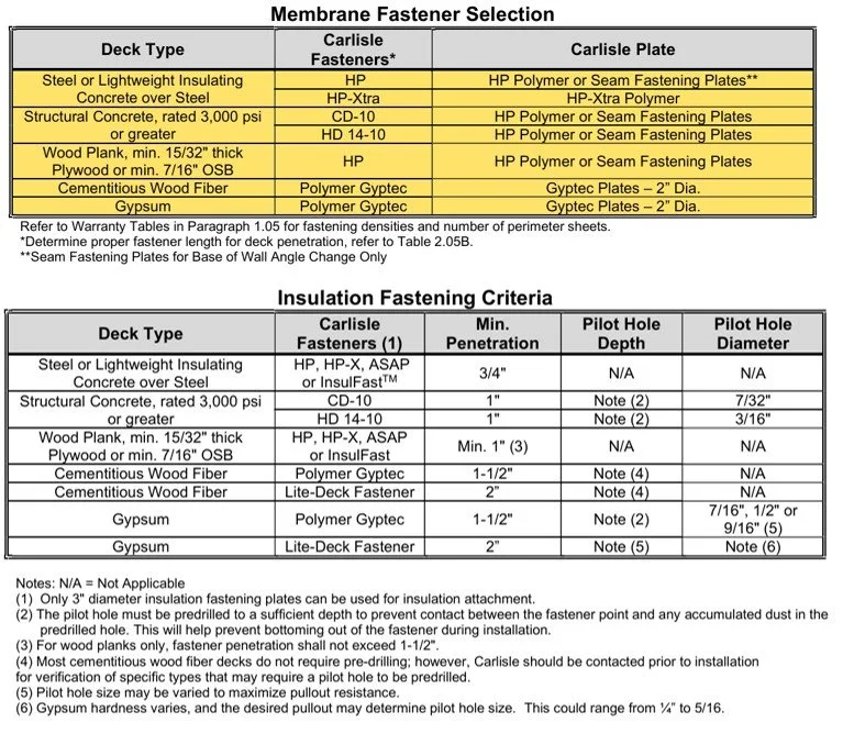 Choosing appropriate plates and fasteners for an upcoming project should be a simple task. Unfortunately, this is not always the case. Variables such as system type, membrane type, deck type, warranty duration, warranty wind speed, sheet width, and roof height must all be taken into consideration when selecting the correct fastener and plate combination for both insulation and membrane securement. Although the Technical Support provided by Carlisle’s Project Review Department and CSL West can assist with creating an acceptable assembly, it’s important to have a basic understanding of when and where a certain plate or fastener is required.