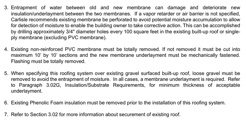Although it is an excellent solution for an overlay, it should be noted that any failure of the existing system is not considered a warranty claim. This should be taken into consideration when determining if the existing roof is a good candidate for an overlay.