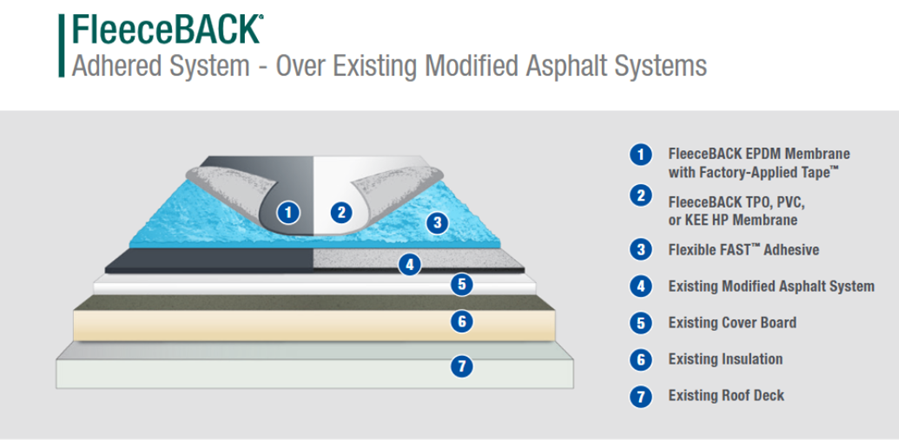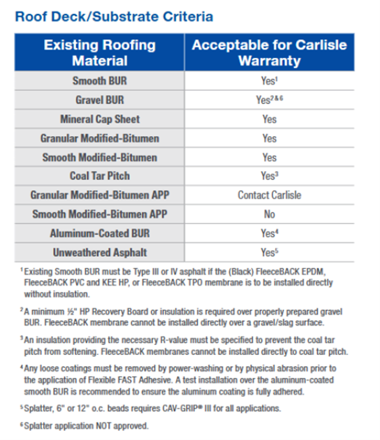 Carlisle will accept FleeceBACK EPDM, TPO, and PVC to be installed directly over an existing asphaltic roofing system. There are a wide range of aged, modified asphalt systems that this system can be installed over.