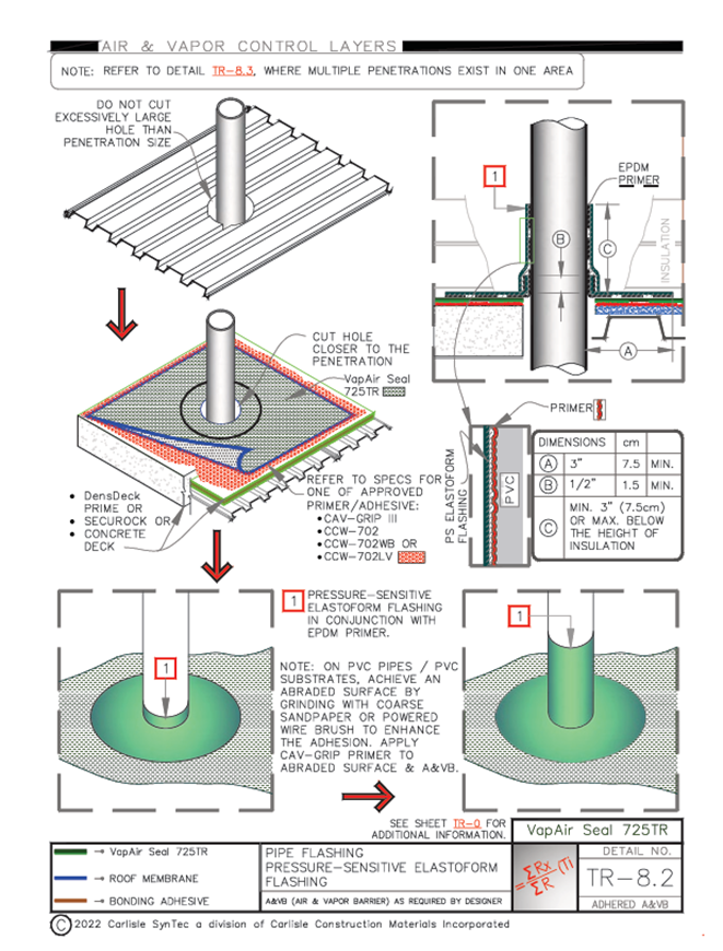 Using Elastoform in lieu of an air and vapor barrier to flash pipe penetrations can be a time saver compared to being flashed with air and vapor barrier material. Elastoform can be used as an air and vapor barrier material on all Carlisle projects regardless of the membrane type. Carlisle’s Air and Vapor Barrier Field Guides include best practices, product breakdowns, application procedures, etc. A link to Carlisle’s Air and Vapor Barrier Field Guide can be found below: